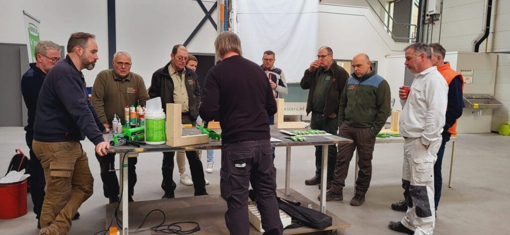 Over de aanpak vertelt Gert Jansen, regiomanager bij Repair Care: “We gaven een hele dag training bij Oostveen op locatie, die perfect was voor het theorie- én praktijkgedeelte. Het was een maatwerktraining, waarbij we de totale groep in tweeën deelden. In 2,5 tot 3 uur per groep behandelden we alles compact, maar compleet.” Roy vult aan: “Aan de trainingsdag namen 20 schilders van Oostveen deel. Daarnaast hadden we 5 timmerlieden van onze partner Geldersch Landschap gevraagd om bij de training aan te sluiten. Die werken namelijk ook met Repair Care en namen onze uitnodiging van harte aan.”