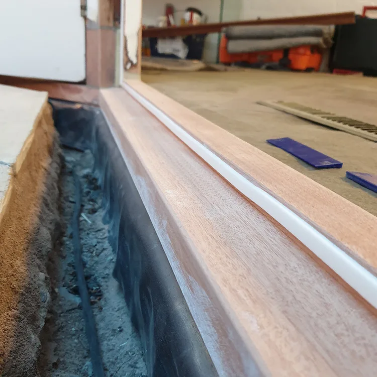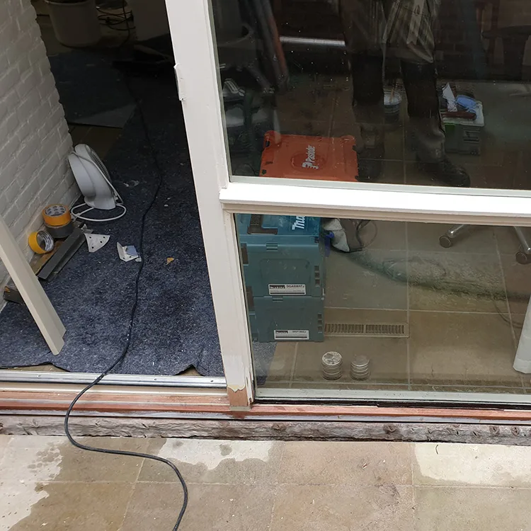 Tegelvloer is in het verleden tegen de houten dorpels aangelegd in de 2 patio’s van de woning. Op gewapend beton gelijmd. Er wilde geen bedrijf aan beginnen.